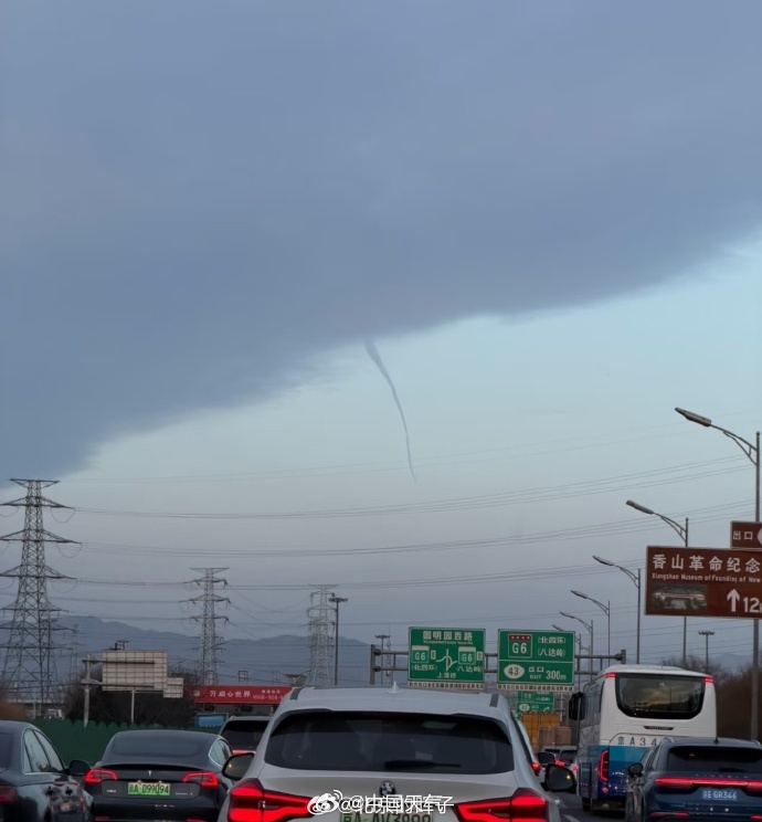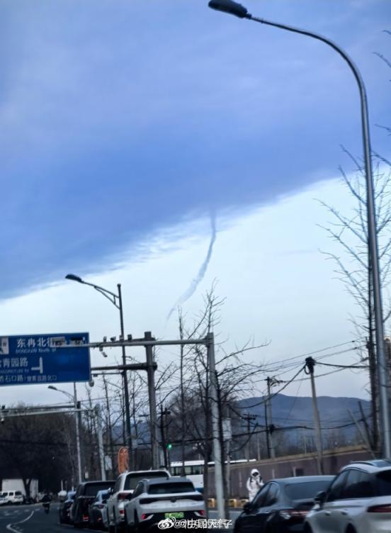 不少网友今天早上拍到北京西边方向天空有疑似“龙卷风”,这到底是啥?中国天气首席气象分析师信欣表示,这可能是云里有些垂直切变形成的漏斗云,不过没接地,应该不算龙卷。