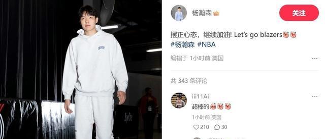 杨瀚森赛后在个人社媒发文写道:“摆正心态,继续加油! Let’s go blazers”。让人没想到的是,杨瀚森的女友出现在了评论区,她就写了三个字“超棒的!”而杨瀚森则在万千评论中只回复了女友的这一条——“必须的”。