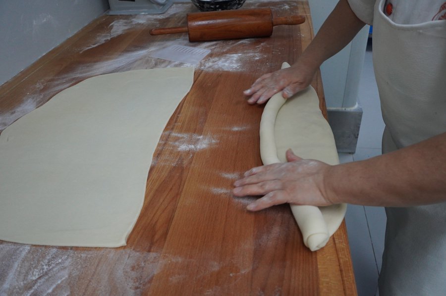 首先,网上讨论的“上海鲜肉月饼”并不仅指鲜肉月饼,而是指上海市场上全手工制作,通过猪油起酥,外皮经反复折叠擀压后烤制而成的月饼。它属于苏式月饼的分支,但具有层次更加分明的酥皮结构;又强调现烤现吃,不仅能感受一层又一层的酥脆饼皮,而且温热的内馅也更加鲜美。